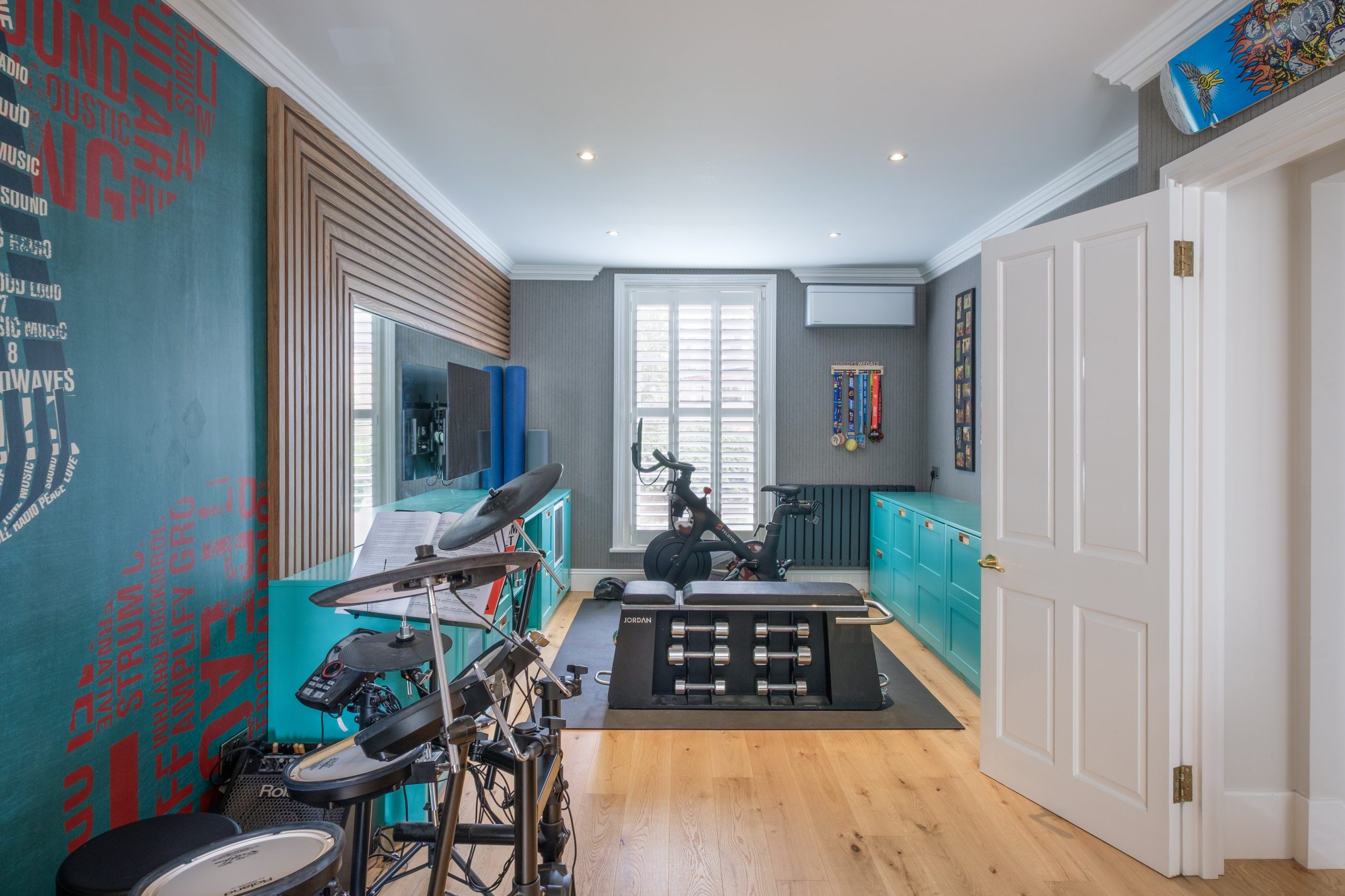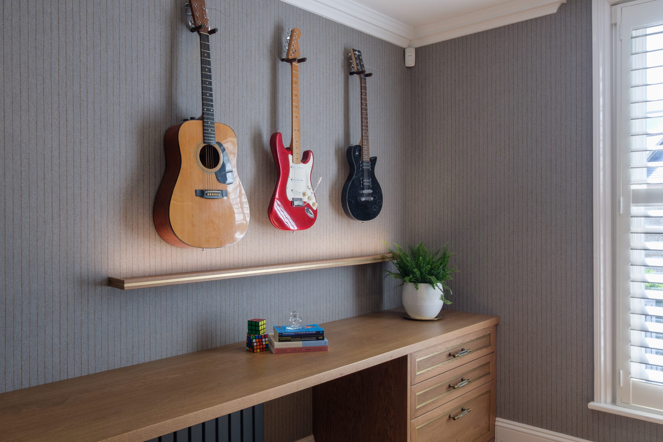 A new floor finish completely refreshed the space, instantly elevating its look and feel. The addition of wallpaper introduced a masculine tone, adding depth and character, while the client’s guitars were seamlessly incorporated as statement pieces, bringing warmth, personality, and an elegant finishing touch.
